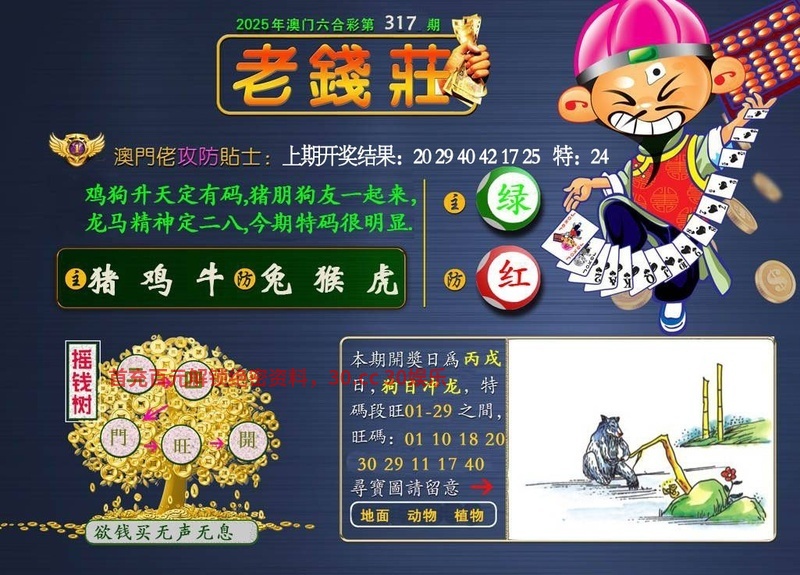 317期独家六合玄机:蓝绿今期发庄家,虎猴今期是特肖,蛇鼠一窝定发家,今期生肖牛马狗 幸运波段:18-31 幸运生肖:鼠猪牛虎马蛇 |